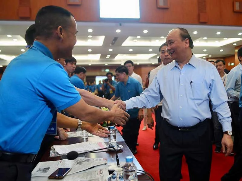 Thủ tướng Nguyễn Xuân Phúc bắt tay công nhân tại buổi gặp gỡ. Ảnh: QUANG LIÊM