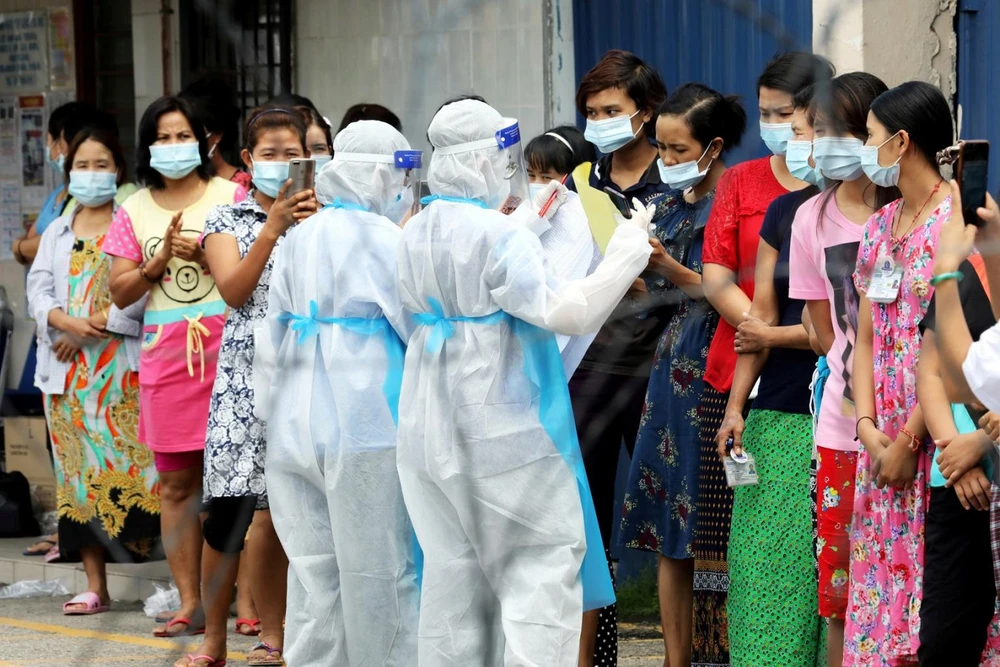 Các nhân viên y tế ở TP Klang, bang Selangor (Malaysia) lấy mẫu xét nghiệm COVID-19 cho các công nhân ở địa phương. Ảnh: REUTERS