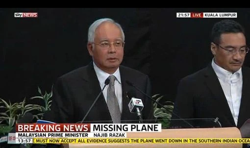 Thông tin này được chính thủ tướng Malaysia Najib Razak xác nhận một giờ sau đó rại buổi họp báo khẩn, bất thường ở thủ đô Kuala Lumpur. Ông Razak nói: “Mọi bằng chứng đều cho thấy máy bay đã rơi ở vùng biển Ấn Độ Dương”.