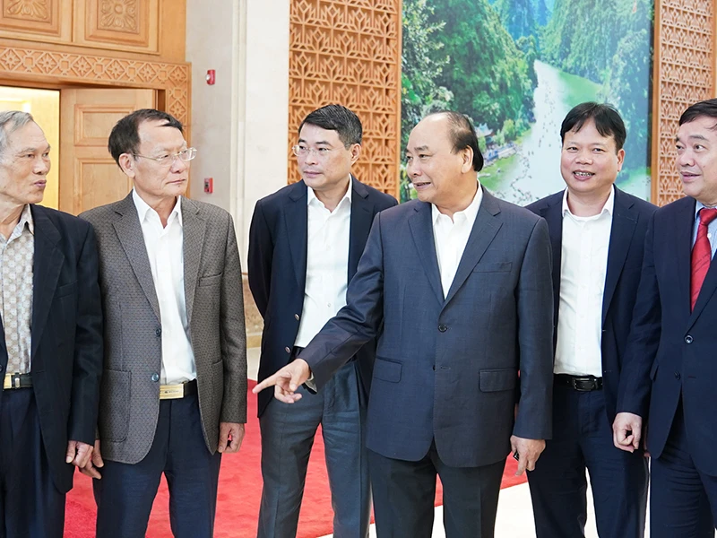 Thủ tướng Nguyễn Xuân Phúc trao đổi với các thành viên Hội đồng Tư vấn chính sách tài chính, tiền tệ quốc gia. Ảnh: VGP/QUANG HIẾU