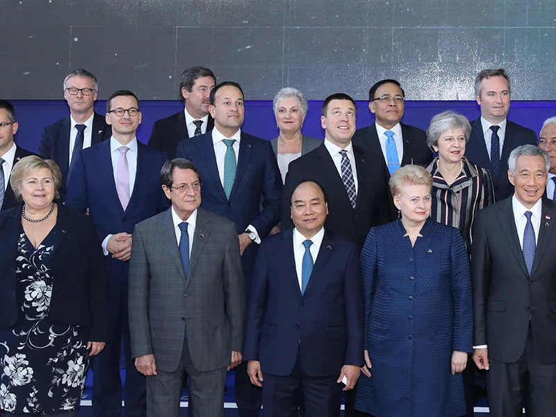 Thủ tướng Nguyễn Xuân Phúc và các trưởng đoàn ASEM chụp ảnh chung sáng 19-10 tại phiên họp toàn thể thứ hai. Ảnh: TTXVN