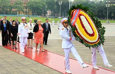 Sáng 17-4, Thủ tướng Na Uy Erna Solberg đến đặt vòng hoa và vào lăng viếng Chủ tịch Hồ Chí Minh. Ảnh: TTXVN