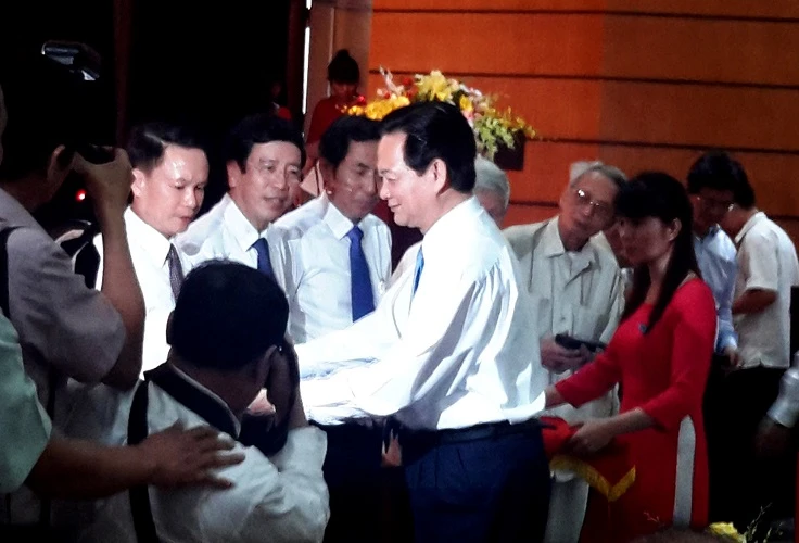 Thủ tướng Nguyễn Tấn Dũng tặng quà cho các nhà báo lão thành. Ảnh V.Thịnh
