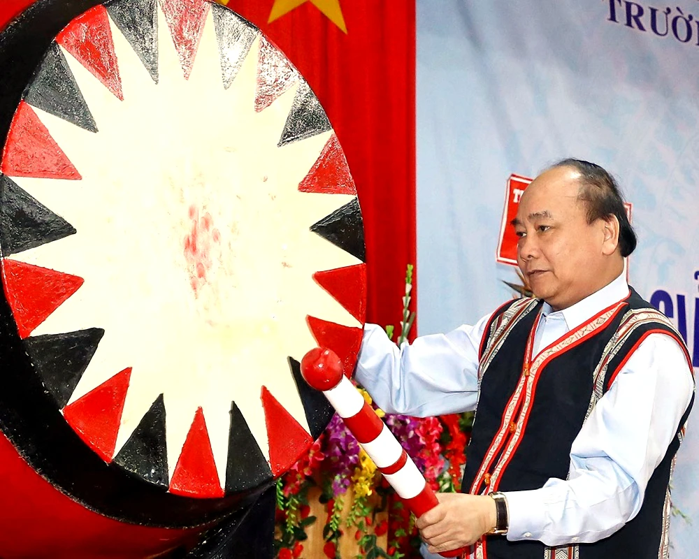 Thủ tướng Chính phủ Nguyễn Xuân Phúc đánh trống khai giảng năm học mới 2018-2019 tại Trường PT Dân tộc nội trú huyện Tu Mơ Rông (Kon Tum).