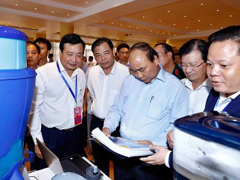 Thủ tướng Nguyễn Xuân Phúc tham quan các gian hàng triển lãm công nghệ trong hội nghị sáng 20-6. Ảnh: M.HIỀN