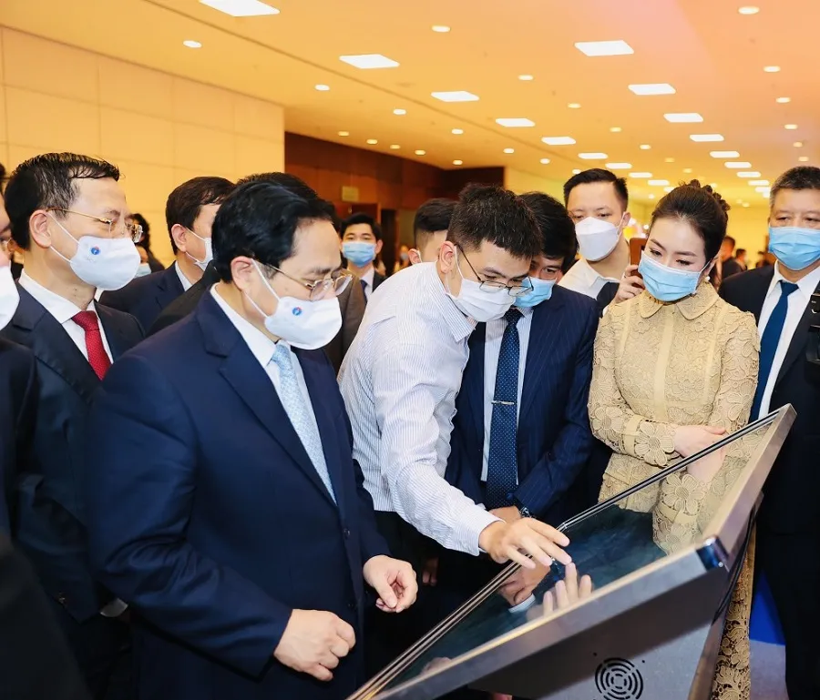 Thủ tướng Phạm Minh Chính và các đại biểu tham quan gian hàng công nghệ số, ngày 11-12. Ảnh: VT