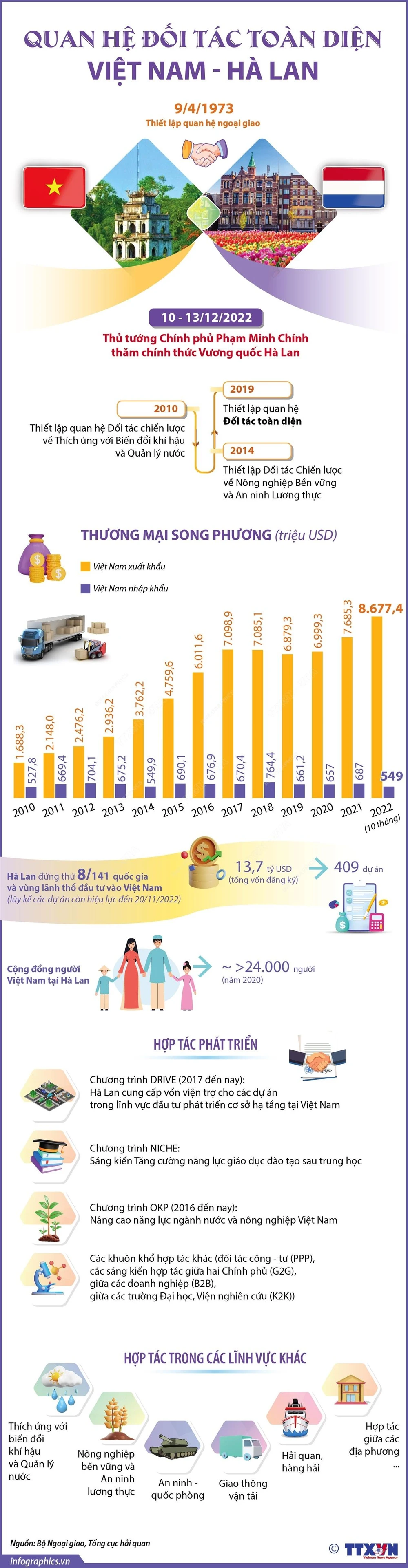 Trong những năm qua, quan hệ Việt Nam-Hà Lan phát triển mạnh mẽ trên nhiều lĩnh vực, nhất là về đầu tư, thương mại, nông nghiệp và ứng phó với biến đổi khí hậu.