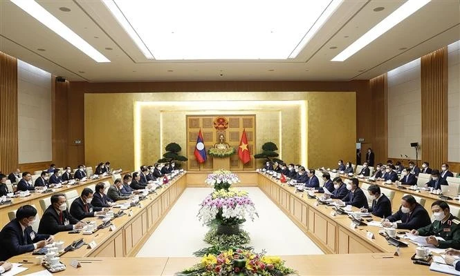 Hội đàm giữa Thủ tướng Phạm Minh Chính và Thủ tướng Lào Phankham Viphavanh. Ảnh: TTXVN