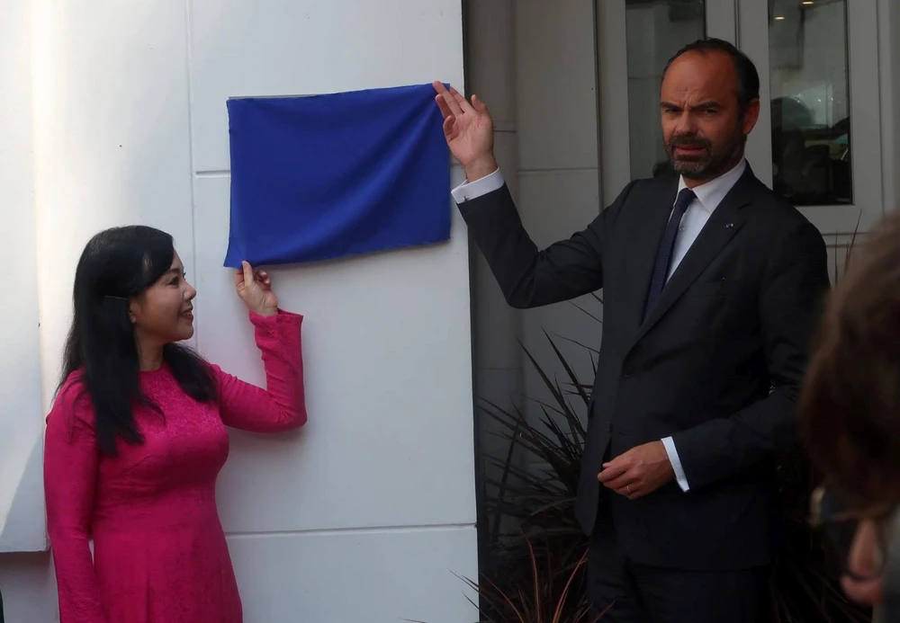 Thủ tướng Pháp Edouard Philippe và Bộ trưởng Bộ Y tế Nguyễn Thị Kim Tiến cùng thực hiện nghi thức khai trương Trung tâm Y tế Pháp. Ảnh: YN