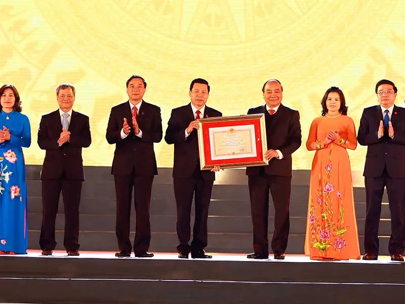 Thủ tướng Nguyễn Xuân Phúc thừa ủy quyền của Chủ tịch nước trao tặng Huân chương Độc lập hạng Nhất cho tỉnh Bắc Ninh.Ảnh: TTXVN