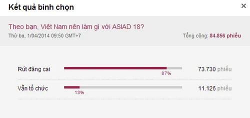 Theo kết quả thăm dò ý kiến trên trang chủ của VnExpress từ đầu tháng 4 đến nay, 87% trong số gần 85.000 độc giả cho rằng Việt Nam nên rút đăng cai ASIAD 18.