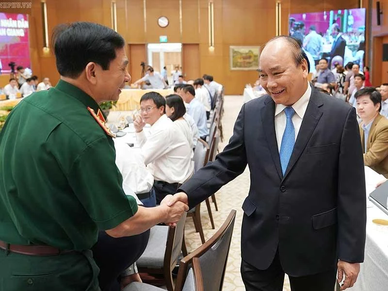 Thủ tướng Nguyễn Xuân Phúc trao đổi với các đại biểu dự hội nghị. Ảnh: VGP