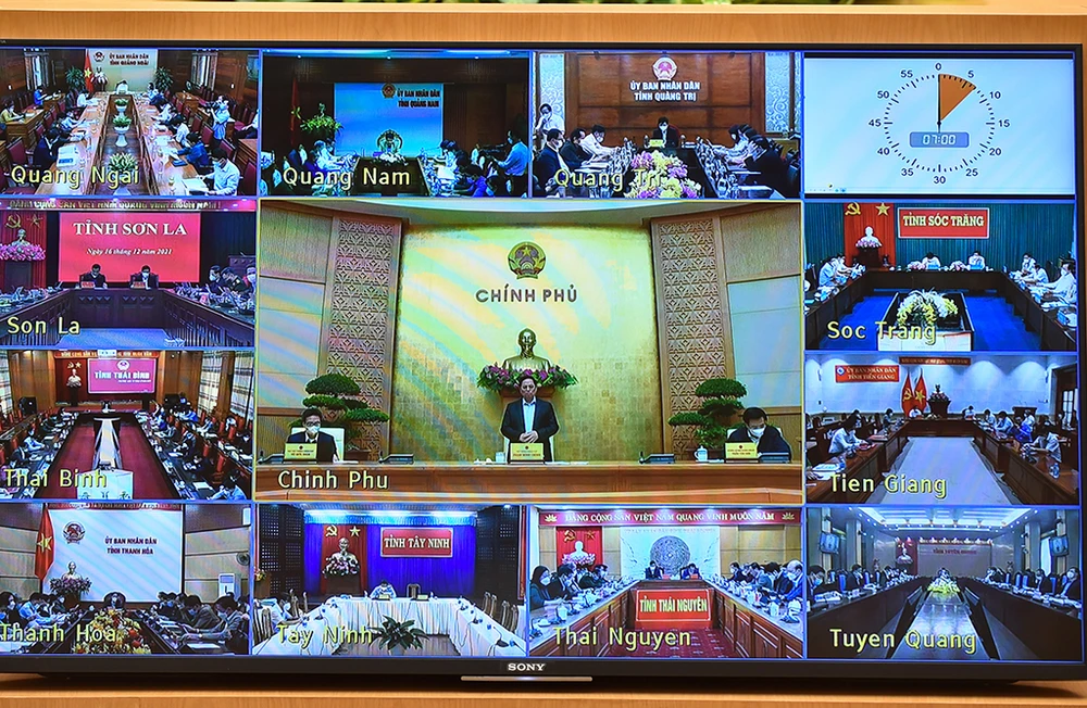 Thủ tướng Phạm Minh Chính chủ trì phiên họp trực tuyến với 63 tỉnh, thành. Ảnh: VGP