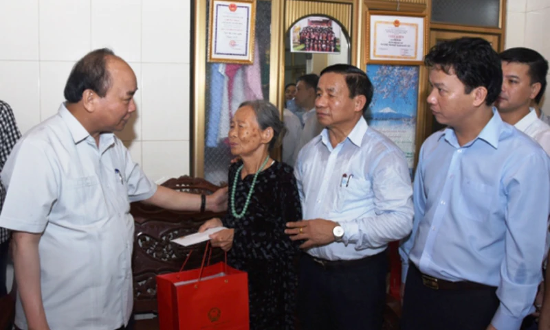 Thủ tướng Nguyễn Xuân Phúc cùng đoàn công tác thăm, tặng quà gia đình mẹ Nguyễn Thị Phi (mẹ liệt sĩ). Ảnh: BHT