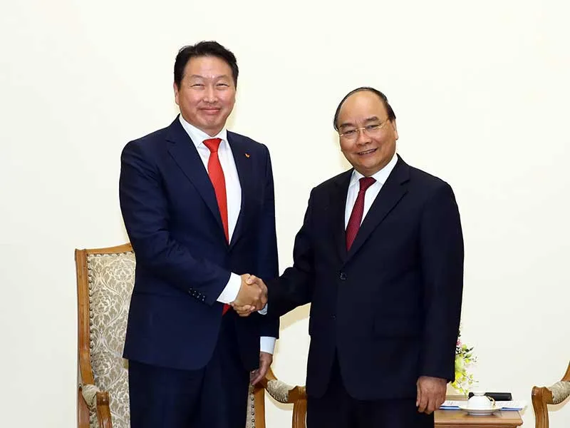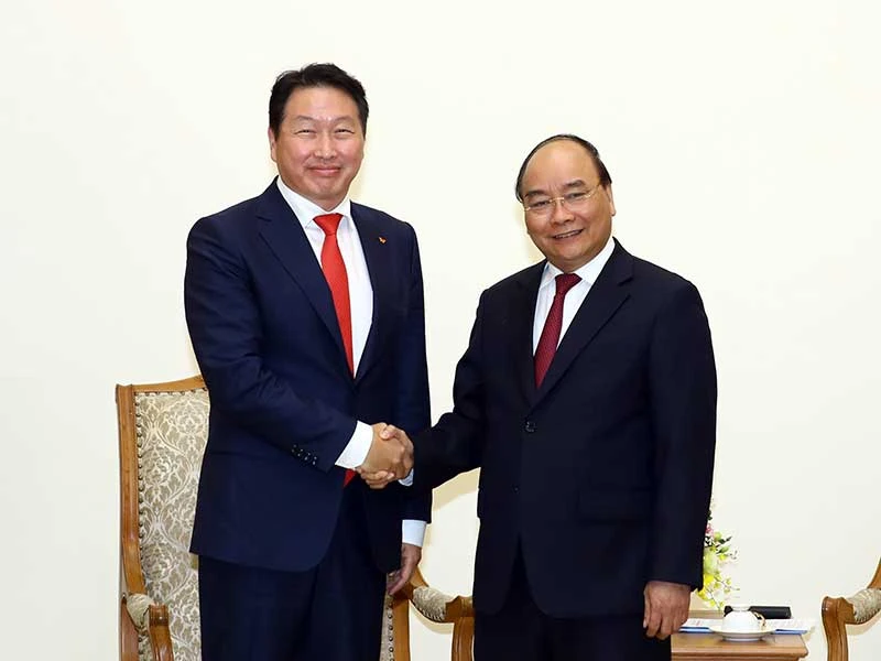 Thủ tướng Nguyễn Xuân Phúc tiếp Chủ tịch Tập đoàn SK Hàn Quốc Chey Tae-won. Ảnh: TTXVN