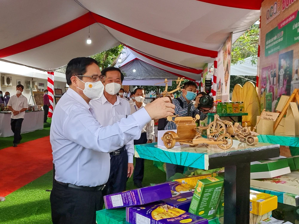Thủ tướng Phạm Minh Chính tham quan các gian hàng trưng bày sản phẩm OCOP của các tỉnh ĐBSCL. Ảnh: MINH THƯ