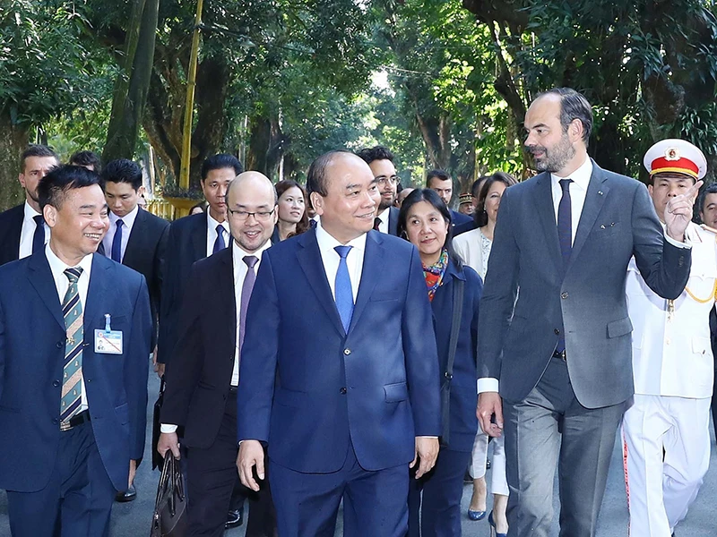Thủ tướng Nguyễn Xuân Phúc cùng Thủ tướng Pháp Édouard Philippe thăm Khu Di tích Chủ tịch Hồ Chí Minh tại Phủ Chủ tịch. Ảnh: TTXVN
