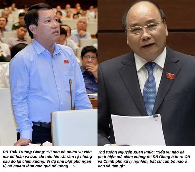 Thủ tướng đáp ngay: “Chúng tôi đồng ý là không để chìm xuồng vụ tham nhũng, tiêu cực nào khi phát hiện”. “Nếu vụ nào đã phát hiện mà chìm xuồng thì ĐB Giang báo ra QH và Chính phủ xử lý nghiêm, bất cứ cán bộ nào ở đâu và làm gì” - Thủ tướng khẳng khái.