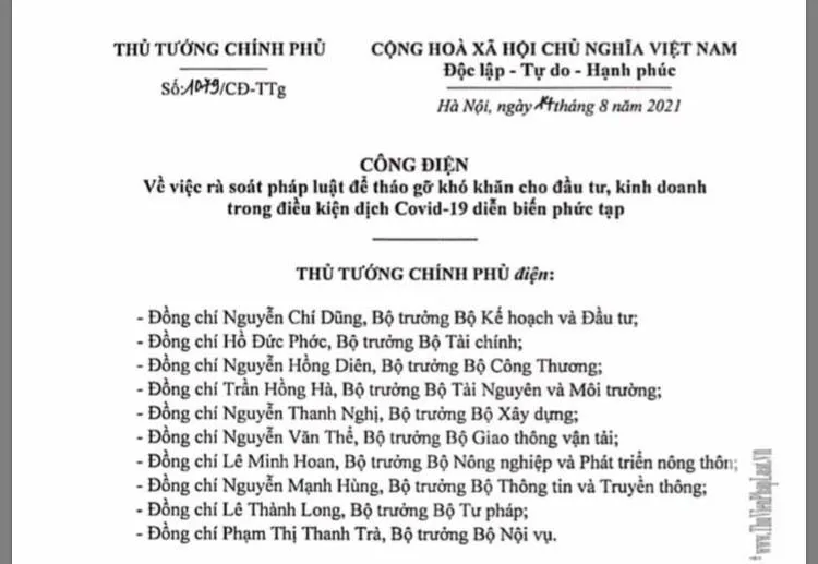 Công điện được gửi cho 10 Bộ trưởng của các Bộ gồm: Kế hoạch và Đầu tư, Tài chính, Công Thương, Tài nguyên và Môi trường, Xây dựng, Giao thông vận tải, Nông nghiệp và Phát triển nông thôn, Thông tin và Truyền thông, Tư pháp, Nội vụ.