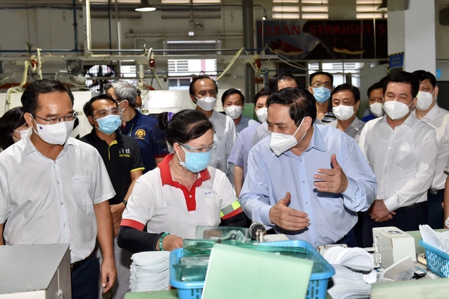 | Trước đó, Thủ tướng Chính phủ cùng Đoàn công tác đã đến thăm kiểm tra tình hình và công tác phòng, chống dịch COVID-19 tại Công ty TNHH giày Chinh Luh Việt Nam, đóng tại Khu công nghiệp Thuận Đạo, huyện Bến Lức, tỉnh Long An; kiểm tra và làm việc tại Bệnh viện dã chiến số 2, huyện Tân Trụ, tỉnh Long An. Thủ tướng Phạm Minh Chính biểu dương tinh thần chống dịch của Công ty TNHH giày Chinh Luh Việt Nam, đồng thời đề nghị cán bộ, công nhân viên Công ty nỗ lực cố gắng, không để đứt gãy hoạt động sản xuất kinh doanh, giữ được đơn hàng. Thủ tướng nhấn mạnh, sản xuất phải an toàn và an toàn để sản xuất, cũng như bảo đảm an toàn cho đội ngũ y, bác sĩ trong công tác khám chữa bệnh, chăm sóc cho bệnh nhân. |