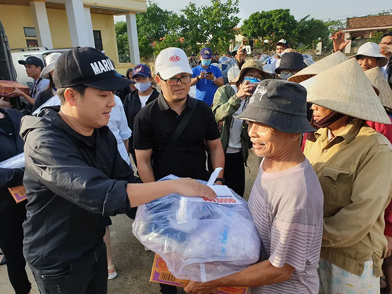 Nghệ sĩ Trường Giang cùng nhà báo Lê Phi, Trưởng đại điện báo Pháp Luật TP.HCM tại Đà Nẵng trao quà hỗ trợ cho người dân xã Tân Ninh, huyện Quảng Ninh, Quảng Bình. Ảnh: HẢI HIẾU
