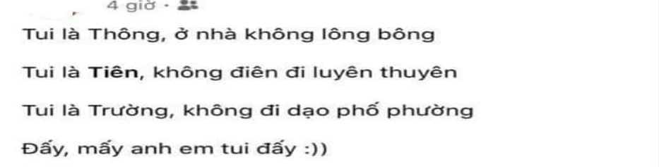 Nếu là một người chuyên cập nhật những xu hướng mới mẻ trên mạng xã hội bạn sẽ không còn lạ lẫm với trend viết status nối chữ của cư dân mạng, trường hợp này cũng không phải một ngoại lệ. Chủ bài viết sẽ viết tên mình ở vế đầu “Tôi tên là …” sau đó sẽ nối với một hành động sao cho hợp vần.