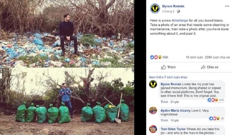 "Thử thách mới dành cho các bạn teen đang chán đây. Hãy chụp ảnh một khu vực nào đó cần dọn dẹp, sau đó chụp lại khi bạn đã thay đổi nó rồi chia sẻ lên mạng", Byron Roman viết trên facebook của mình.