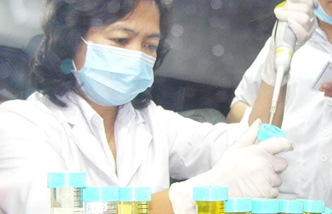 Nhân viên Chi cục Thú y TP.HCM xét nghiệm chất cấm trong nước tiểu heo. Ảnh: TRẦN NGỌC