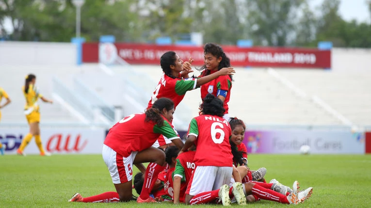 Các cô gái Bangladesh ăn mừng bàn thắng trong trận hòa 2-2.