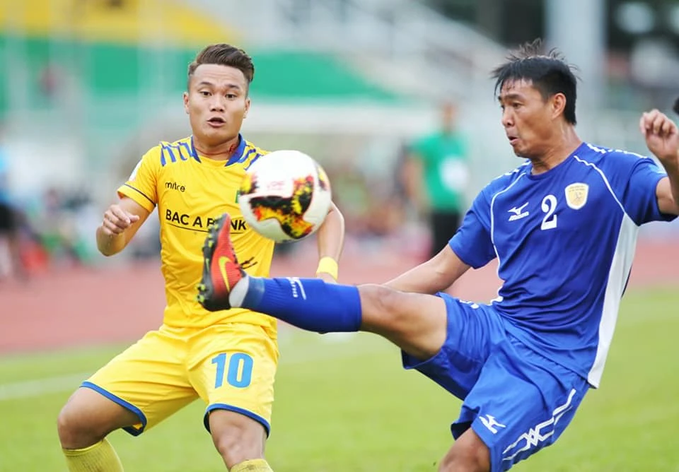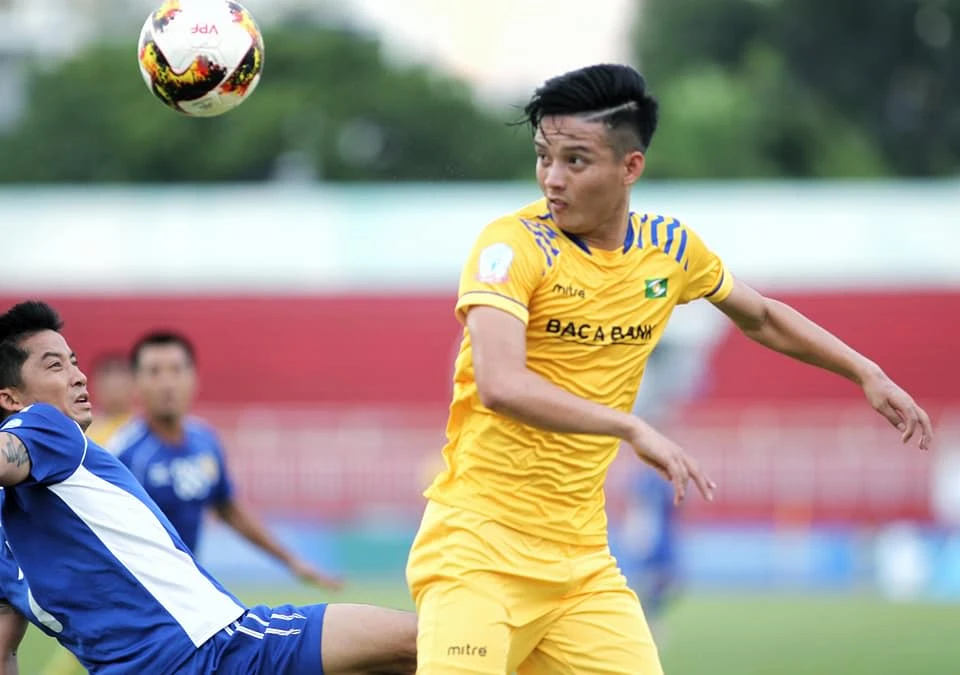Minh Hòa (2, TP.HCM) trong pha tranh bóng cùng Phi Sơn (SL Nghệ An). Ảnh:BẠCH DƯƠNG