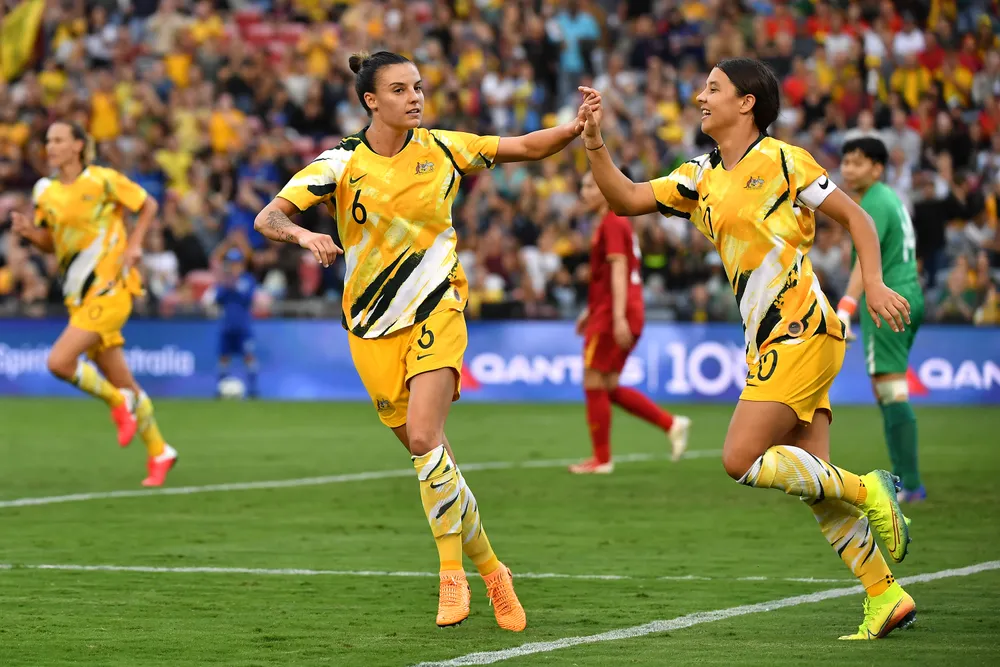 Sam Kerr (phải) người mở điểm và "chốt" điểm 5-0 cho Úc.