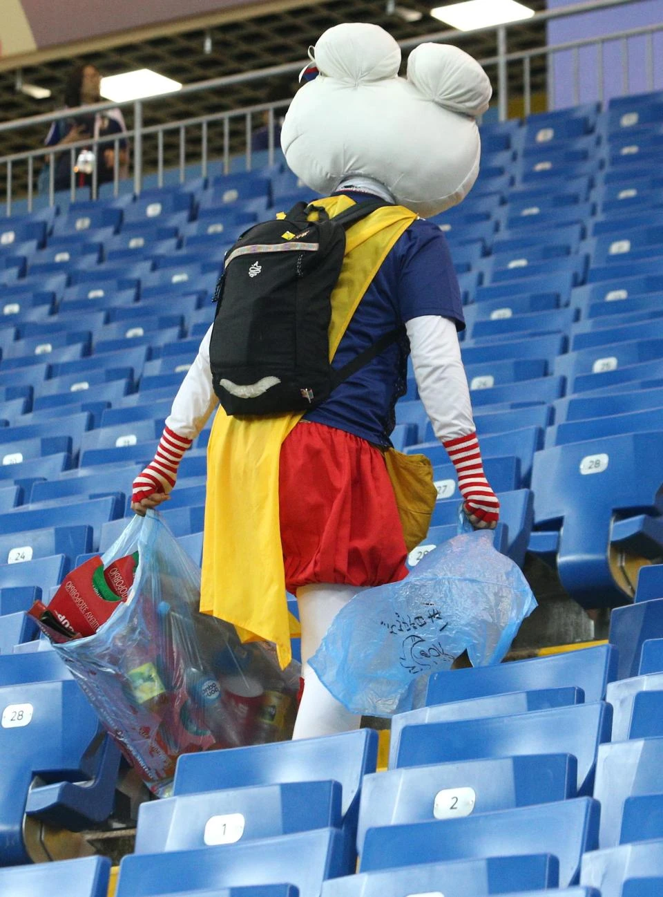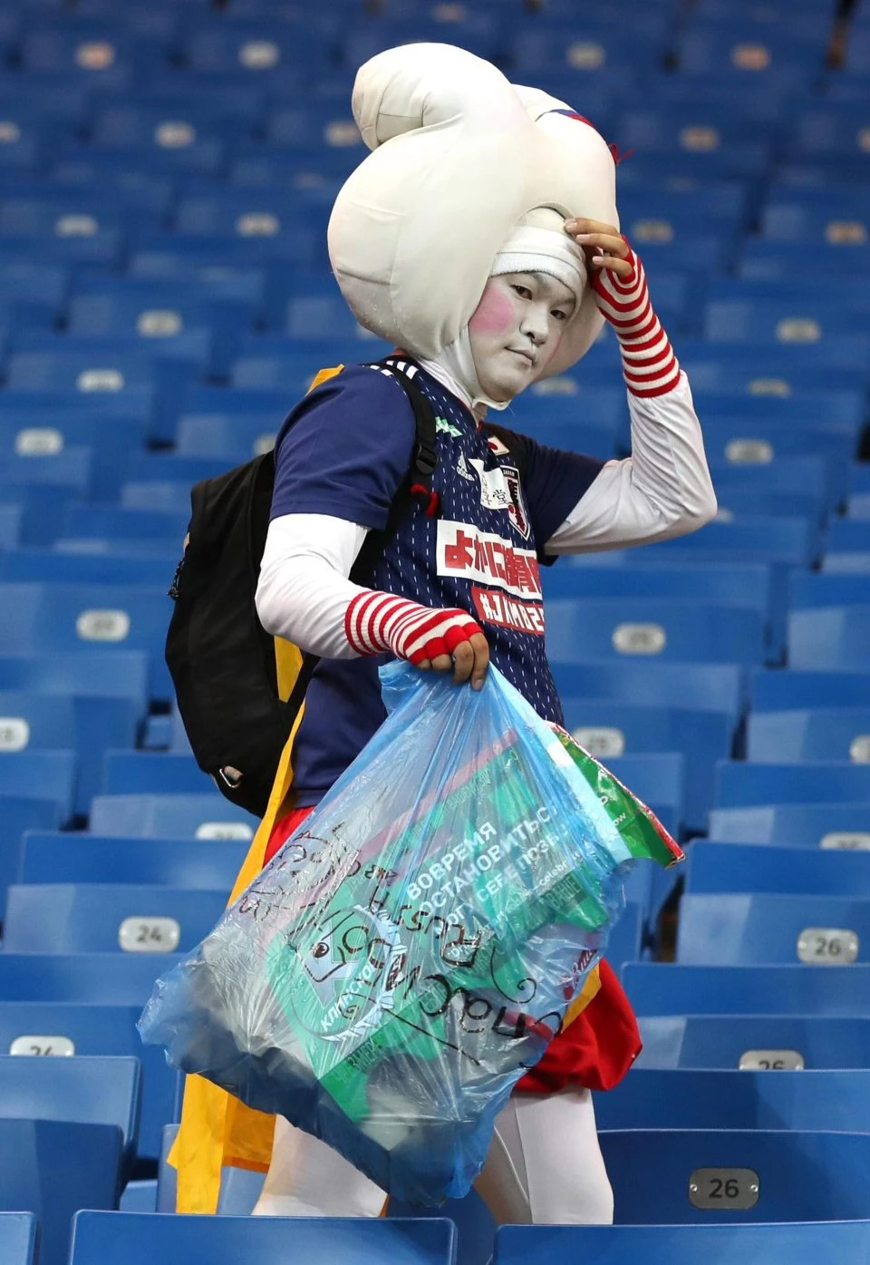 Một người hâm mộ với hai chiếc túi lớn đựng đầy rác.