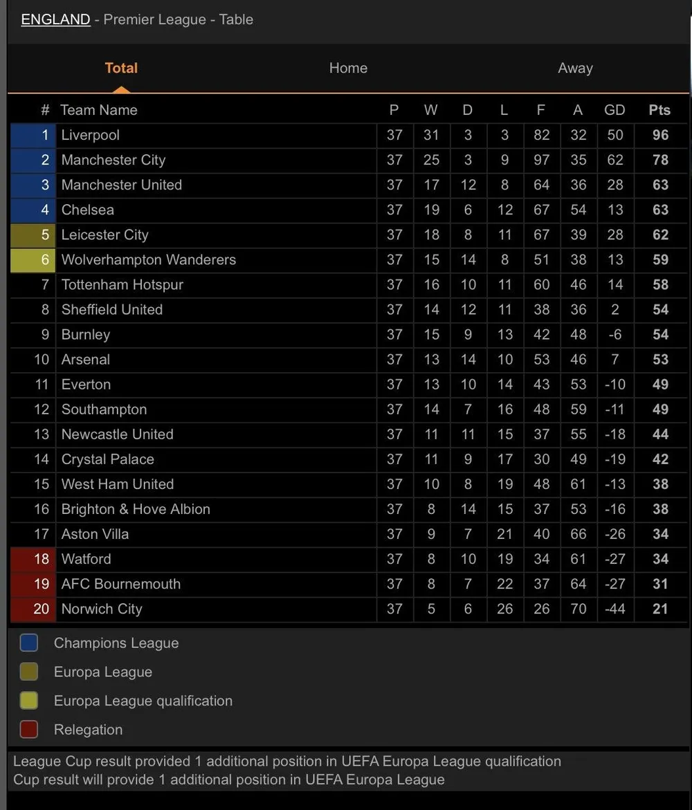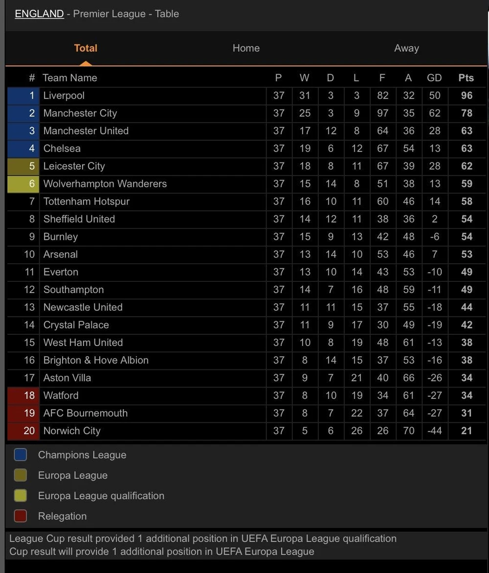 Liverpool có màn nâng cúp vô địch quốc gia Anh sau 30 năm đầy hoành tráng trong cơn mưa bàn thắng ở trận cuối cùng mùa giải trên sân nhà Anfield. Trong khi đó, Chelsea phải chờ trận cuối cùng gặp Wolverhampton trên sân nhà mới biết mình có duy trì vị trí trong Top 4 hay không.
