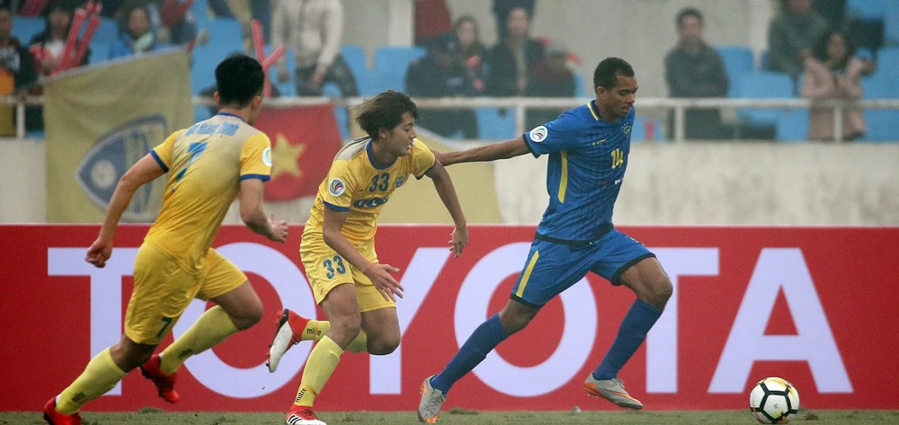 Các cầu thủ FLC Thanh Hóa... đuối dần đều. Trong ảnh: Các cầu thủ FLC Thanh Hóa (áo vàng) trong trận đầu tiên thắng Cebu Global 1-0.