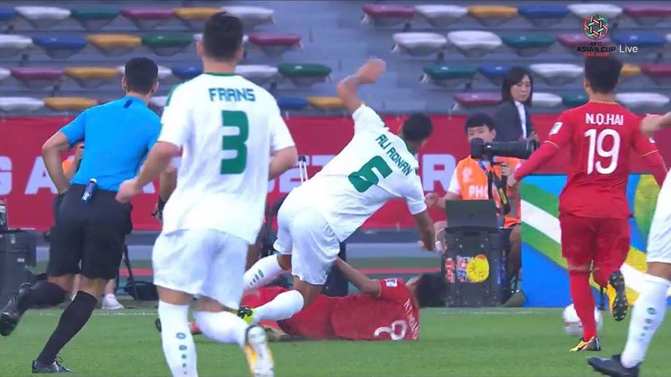 Phút 21, Iraq có liên tiếp hai pha dứt điểm cận thành rất nguy hiểm nhưng hàng thủ Việt Nam đã chơi lăn xả giải nguy.