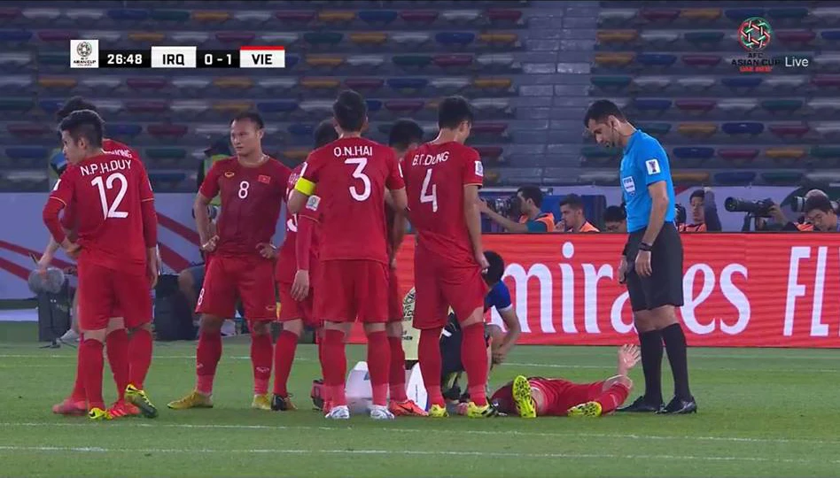 Phút 28, Duy Mạnh phải nằm sân và máu đã rơi trên mặt trung vệ tuyển Việt Nam.