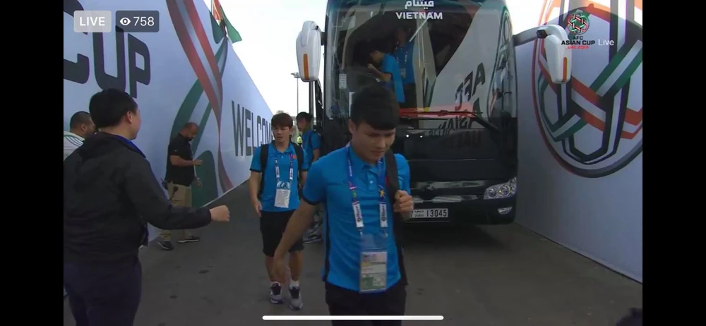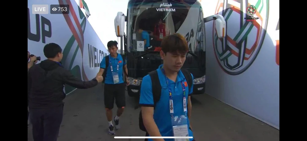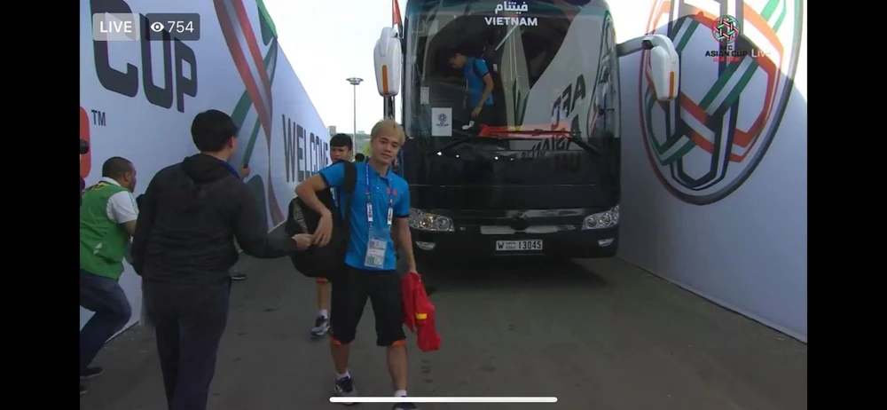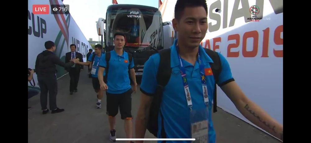 Các cầu thủ Việt Nam bước xuống xe buýt vào sân thi đấu.