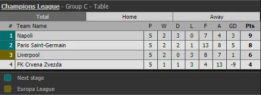 Trước lượt trận thứ năm Champions League, tình hình bảng C khá căng thẳng khi những CLB có thực lực như Liverpool, Napoli và PSG cạnh tranh nhau rất quyết liệt, còn FK Crvena Zvezda cũng không đứng ngoài cuộc chơi.