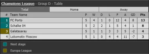 Tại bảng D, mọi thứ cũng ngã ngũ sớm khi Porto giành chiến thắng 3-1 trước Schake, còn Lokomotiv Moscow ngăn bước Galatasaray bằng chiến thắng 2-0 trước đối thủ. Điều này gián tiếp giúp Schake chính thức đi tiếp với vị trí thứ hai khi có 8 điểm. Ngôi đầu bảng thuộc về Porto có 13 điểm. Galatasaray 4 điểm và Lokomotiv Moscow 3 điểm sẽ chỉ còn cạnh tranh chiếc vé dự Europa League.