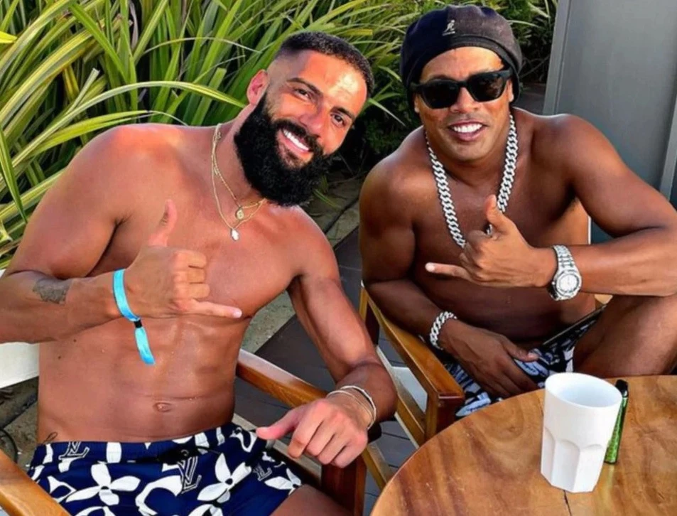 Tuyển thủ nhập tịch tuyển Malaysia Liridon Krasniqi tại Dubai cùng Ronaldinho. Ảnh: NST