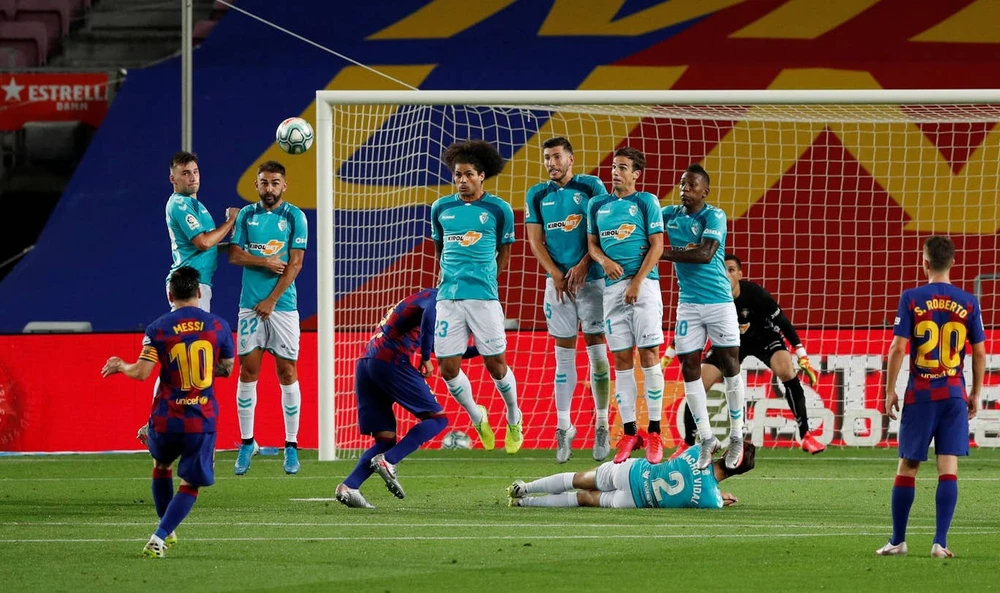 Siêu phẩm của đội trưởng Messi giúp đội nhà san bằng tỉ số 1-1. Ảnh Reuters.