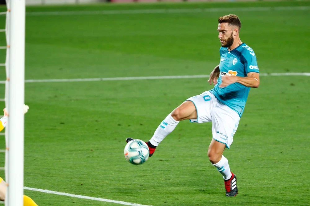 Jose Arnaiz ra chân cực nhanh đưa Osasuna vươn lên dẫn trước. Ảnh: Getty Images.