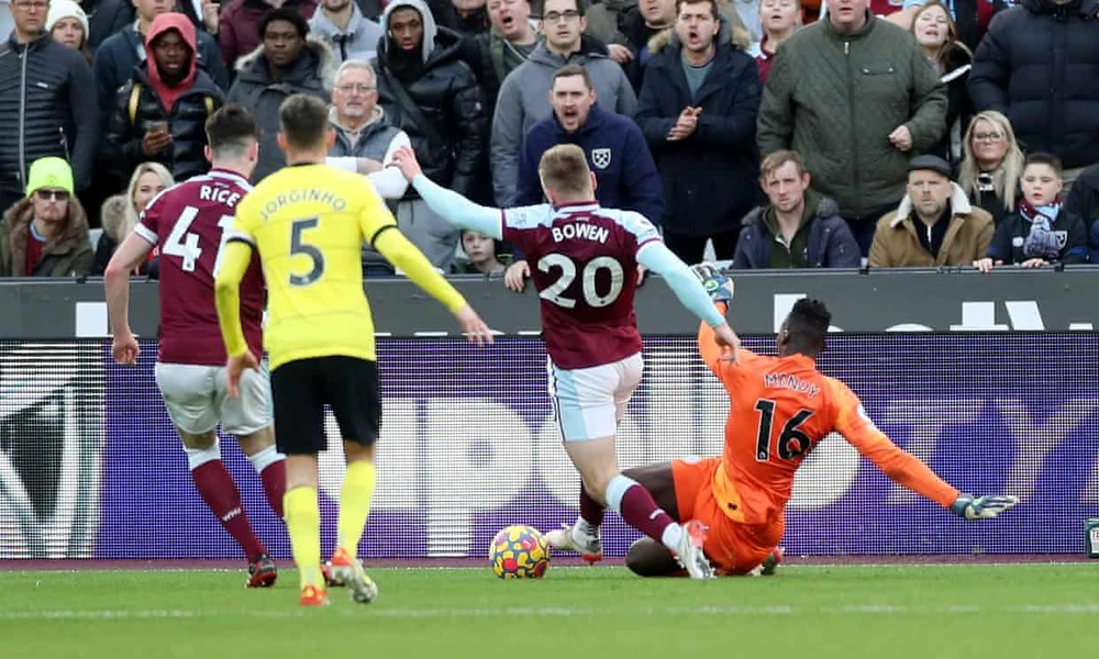 West Ham gỡ hòa 1-1 trên chấm phạt đền khi Bowen bị thủ môn Mendy phạm lỗi trong vòng cấm. Ảnh: Reuters.