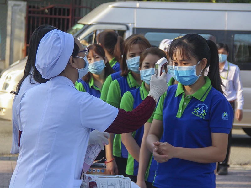 Giáo viên được kiểm tra thân nhiệt trước lúc vào trường vào sáng 3-2. Ảnh: P.THÀNH