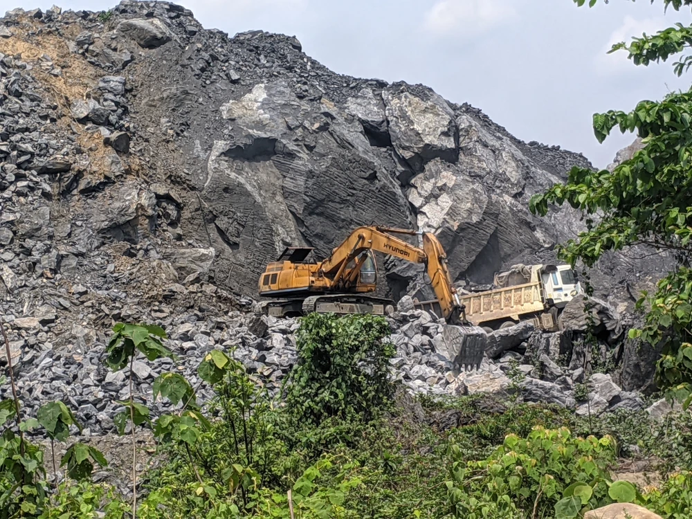 Ghi nhận của PV tại khu vực mỏ đá ngày 23-4 cho thấy sát vách núi một chiếc xe xúc đang xúc những khối đá qua hai xe tải để chở đến vị trí đặt máy xay. Giữa công trường có nhiều bãi đá dăm đã được xay nằm thành từng đống lớn, nhỏ. Mọi hoạt động vẫn diễn ra bình thường.