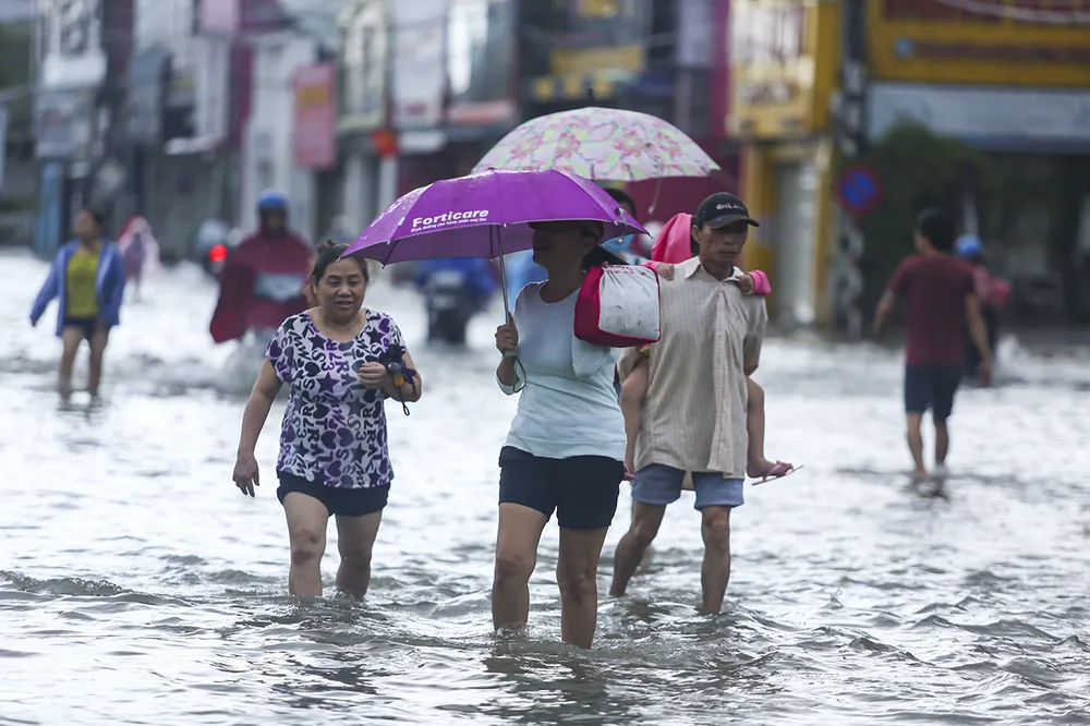 Người dân TP Huế bì bõm trong nước lũ. Ảnh: ND