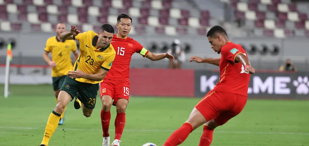 TQ (đỏ) bị Úc chọc thủng lưới ba lần rạng sáng 3-9. Ảnh: AFC