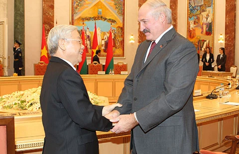 Tổng thống Cộng hòa Belarus A. Lukashenko đón tiếp Tổng Bí thư Nguyễn Phú Trọng. Ảnh: TTXVN