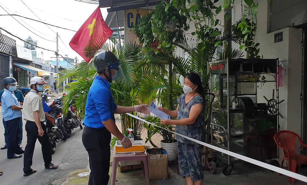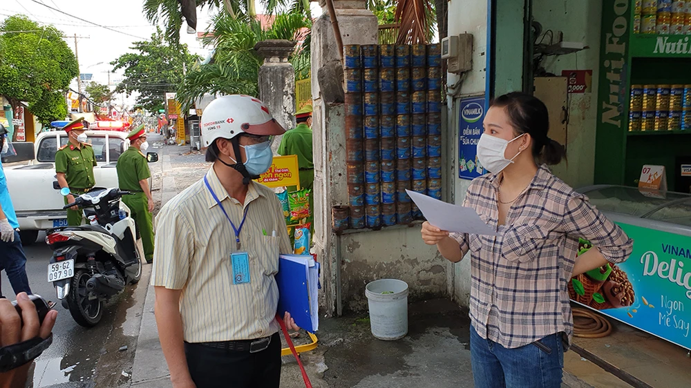 Mỗi gia đình trên địa bàn phường được phát một giấy đi đường mua thực phẩm theo đúng quy định. Ảnh NT
