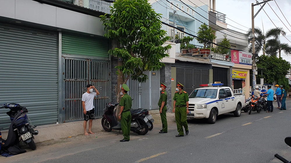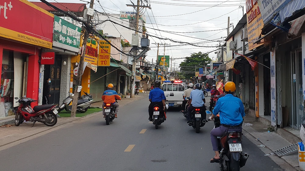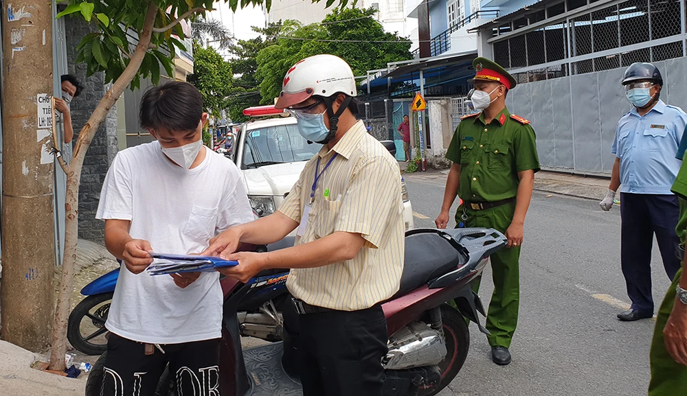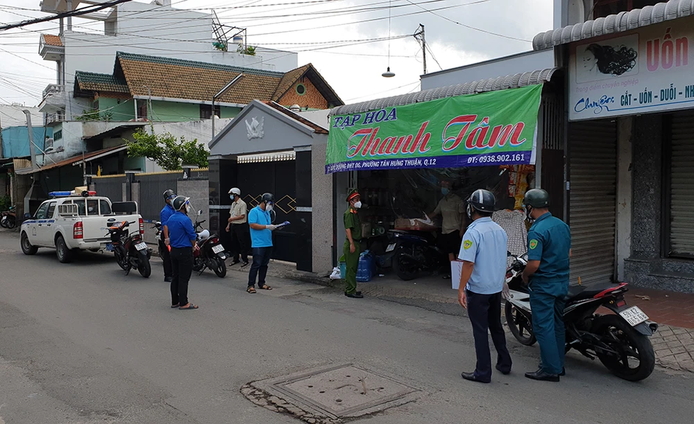 Ngày 24-7, tổ công tác của UBND phường Tân Hưng Thuận, TP.HCM thực hiện tuần tra, nhắc nhở người dân tuân thủ các quy định sau khi Bí thư Thành ủy TP.HCM Nguyễn Văn Nên ký Chỉ thị khẩn số 12 về tăng cường một số biện pháp thực hiện Chỉ thị 16 của Thủ tướng về phòng chống dịch COVID-19 trên địa bàn TP.HCM. Ảnh NT